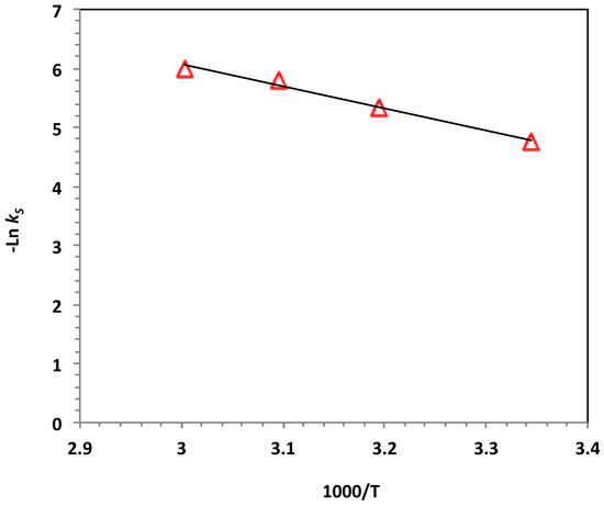 The activation enthalpy can be estimated from Equation (4), , and the entropy of activation, , where kB is Boltzmann constant and h is Planck’s constant. Accordingly, the thermodynamic data are displayed in Table 5. Positive values of activation energy ( over the temperature range signify that the reaction was exothermic. Gibbs free energy of activation exhibited positive values, meaning the process was not spontaneous. This could be a result of the formation of a well-solvated structure between the Nudrin molecules and ˙OH radicals that was also maintained by a negative entropy of activation [35].