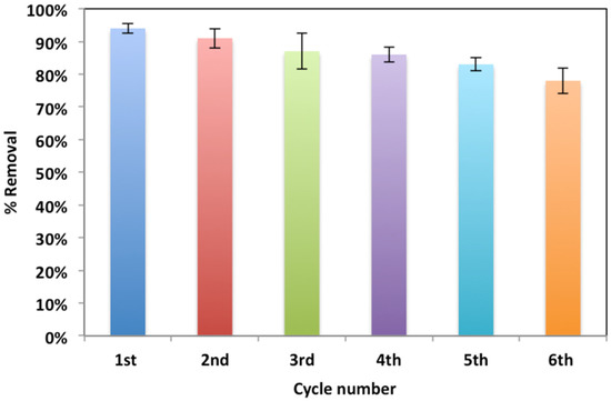 In order to verify the modified Fenton system sustainability concept, five treatment cycles were conducted using WSD:Mag catalyst after fresh composite use. For successive treatments, the catalyst was collected and activated after each use by filtration followed by washing with distilled water and then drying in an electric oven at 105 °C for 1 hour. For the same irradiance time, the successive use of the catalyst in the form of Fenton reaction oxidation revealed a reasonable decline in the WSD:Mag catalyst. The data displayed in Figure 12 confirm that oxidation was 78% for the sixth cycle and 94% for the first. This could be due to the WSD:Mag loaded with Nudrin molecules occupying the composite active sites and therefore hindering the oxidation rate [7]. Furthermore, the catalyst loss after each cycle was determined and found to be less than 12%. Such results confirm the sustainability of the catalyst.