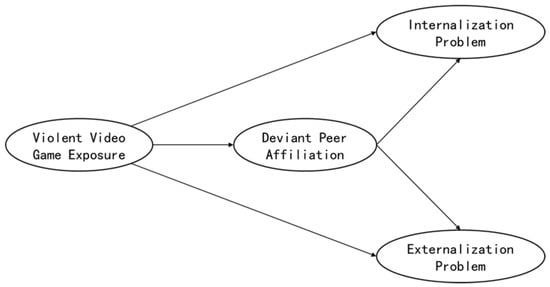 Since the beginning of the 21st century, with the rapid development of the Internet, video games have been an important leisure and entertainment tool for children and adolescents. Violent video games, as a popular game genre, are vital for the development of children and adolescents. Based on PBT, violent video games serve as a virtual external environment that can influence the production and dissolution of PBs among children and adolescents. Scholars have investigated the effects of violent video games on children and adolescents. Through multiple meta-analyses, they established that violent video games significantly adversely affected aggressive behavior, aggressive affect, violent desensitization, and mental health []. Moreover, few studies have found that deviant peer affiliation (DPA) may mediate the relationship between risk factors and PBs. For example, Bao et al. (2015) found that school climate indirectly predicts juvenile criminal behavior through adverse peer interactions []. Sun and Sun (2021) suggested that peer influence may mediate the relationship between violent video games and PBs []. Violent video games and peers are critical environmental factors that affect children’s and adolescents’ PBs.