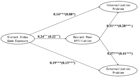 Gender differences in mediating role of deviant peer affiliation. Note: The path coefficient is male outside the brackets and female inside the brackets; the load coefficient between each latent variable and its index, the residual error and error of all variables, and the control variable coefficient are omitted to simplify the model. * p < 0.05, *** p < 0.001.