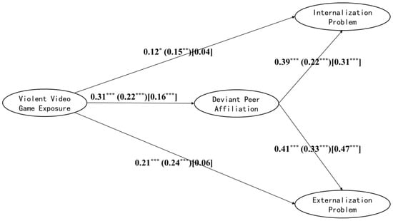 Second, DPA mediated the relationship between VVGE and IP and EP, validating research Hypothesis 2 that VVGE affects PB by increasing children’s adolescents’ DPA. Games have a significant impact on children’s and adolescents’ peer interaction as a way of maintaining friendship. According to social network theory [], individuals who are chronically exposed to violent games may be increasingly exposed to undesirable peers through a process of “selection”. The “selection” process refers to children and adolescents actively choosing peers with similar behaviors as their peers. Children and adolescents chronically exposed to violent video games tend to have more IPs or EPs. They may voluntarily join peers identical to them through a selection process based on similarity. The influence of undesirable peers on children and adolescents’ PB results from the interaction between children and adolescents and undesirable peers. This interaction is two-way, including the “socialization” process and the “selection” process. The process of “socialization” refers to children and adolescents making friends with peers who exhibit PB; they may develop similar behaviors under the influence of peer pressure and other factors. These two processes interact; children and adolescents who play games select peers with behavioral problems, and interactions with undesirable peers increase their own problem behaviors []. Simultaneously, friendships with undesirable peers tend to be unstable, and interactions with them tend to increase traditional peer rejection, which also increases the risk of IPs and EPs in children and adolescents.