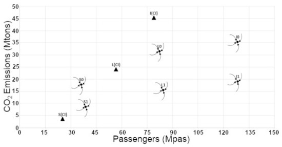 A number of models for the evolution of air passengers and related emissions were proposed, as Ref. [] or [,,,], which took into account the effects and issued projections for the future emissions and even the subsequent warming under different economic scenarios. The two studies Refs. [,], in which the 1996–2008 economic scenarios were considered, found that the introduction of the effects of technological progress could not achieve a stabilization of CO emissions in the midterm (projections for 2008–2025). Such a stabilization was obtained in Ref. [], but only by relying on the Randers economic scenarios [] and considering a quite optimistic estimation of the reductions introduced by the technological progress [,].