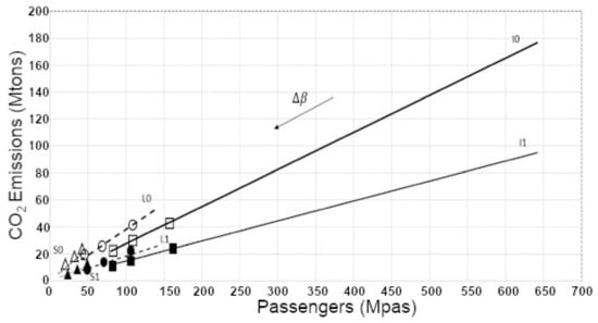 However, there are movements that seek a true cancellation of the CO footprint, by diverting passengers to cleaner transport means or avoiding unnecessary trips and replacing them with telematic meetings. The values assigned to the parameter a could vary between −0.05 and −0.1. The greater absolute value was a very conservative estimate, considering 4% of the cancellation induced by increases in fuel taxes and airport charges. The cancellation rate attributed to the growing environmental awareness of passengers can range from 1% to 6%, depending on the other conditions as well. After the 2008 crisis, for example, a significant number of executives travel (estimated at 3%), were cancelled [].