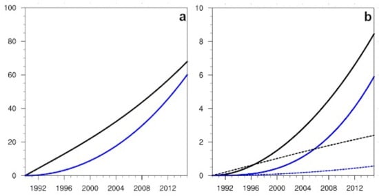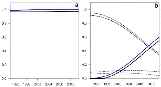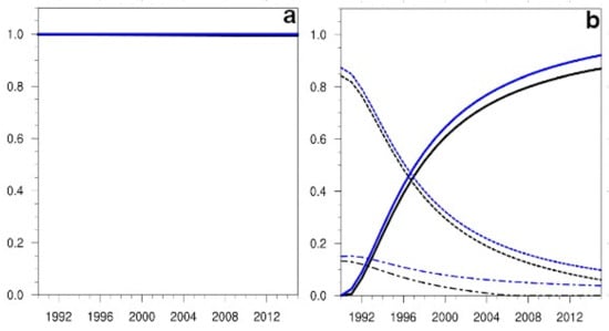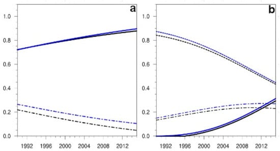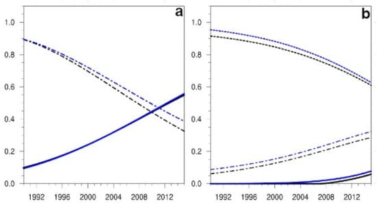 (a) Projection in time from the 1990 initial conditions of the Sobol sensitivity indices, first order (represented with black lines) and total (depicted with blue lines), for the variable passengers, in the case of National flights (S). Line styles are the same as in Figure 3a. (b) The evolution in time of the Sobol indices, first order and total, for the variable emissions. The sensitivities to the parameter term are depicted with solid lines, those to the term with short dashed lines, and the ones to the term with short and long dashed lines.