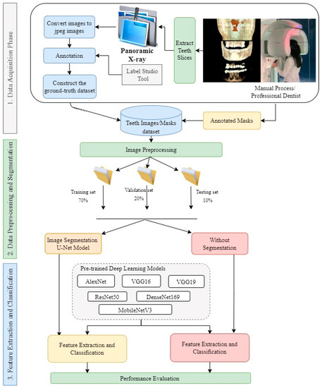In this study, deep learning models were trained to detect and classify the missing teeth region from a dataset segmented from CBCT images of confidential patients who regularly visited the Taibah University dental hospital. The experimental part of this study was implemented jointly at the Faculty of Dentistry and the College of Computer Science and Engineering at Taibah University, K.S.A. Generally, the proposed approach is divided into three main stages: the data acquisition stage, the data preprocessing and segmentation stage, and the feature extraction and classification stage. To ensure that the proposed model was able to classify the images correctly, the collected images were of different patients of different ages. As a result, 500 CBCTimages were collected. Since the images were in 3D dimension, an expert with more than 10 years of professional experience in dental implant planning was to be responsible for slicing and extracting 2D X-ray images from the original CBCT images. The professional dentist was also asked to manually annotate the sliced/extracted images as well as manually segment the missing tooth regions and positions. As a result, the obtained images were used as ground-truth masks for training the proposed deep learning models. In the second stage, the dataset along with the masks, were fed to the segmentation stage, in which augmentation was also performed. In this study, we designed two experiment types based on the presented segmentation techniques. For this purpose, the U-Net model was used in the segmentation stage. In terms of classification models, several deep learning architectures were implemented and tested, including the AlexNet, VGG16, VGG19, ResNet50, DenseNet169, and MobileNetV3 models. These models were used to classify the resulting binary masks from the segmentation stage well as to classify the original images without segmentation. As the pretrained DL models are originally capable of classifying up to 1000 different classes, the last fully connected layer of these models was replaced so that it can be capable of classifying the binary classes of the used dataset. We also compared the output of the proposed models to the ground-truth dataset that was annotated by the domain expert. Figure 1 shows the whole process of the followed methodology.