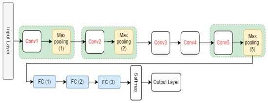AlexNet is a CNN model proposed by Krizhevsky et al. [26]. It has eight layers with learnable parameters, including five convolutional layers, three fully connected layers, and three max-pooling layers that are connected after the first, second, and fifth convolutional layers, respectively. As an activation function, AlexNet model uses the Relu activation function in all its layers except the output layer. The original AlexNet architecture and its configuration settings are shown in Figure 3 and Table 1, respectively.