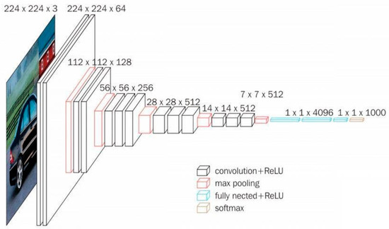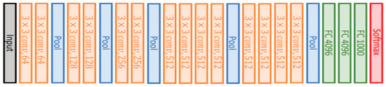VGG19 is a variant of the VGG16 model in which three new convolutional layers were added up to the previous VGG16 model. There are 19 layers (16 convolution layers and 3 fully connected), 5 max-pooling layers, and 1 SoftMax layer. Figure 5 shows the VGG19 architecture.