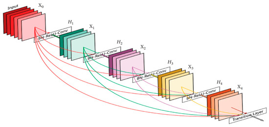 A dense convolutional network (DenseNet) is an expansion of the Residual CNN (ResNet) architecture. Indeed, there are several DenseNets such as, DenseNet121, DenseNet169, and DenseNet201. In this paper, the DenseNet169 was used. As indicated in its name, the architecture of this model contains 169 layers. The reason for this choice is due to the ability of DenseNet169 to handle the vanishing gradient problem compared to the other versions [28]. In addition, it has a minimal number of parameters. In contrast to ResNet and other convolution neural networks, DenseNet-based models provide an immediate connection between each layer and all descendant layers, as shown in Figure 7.