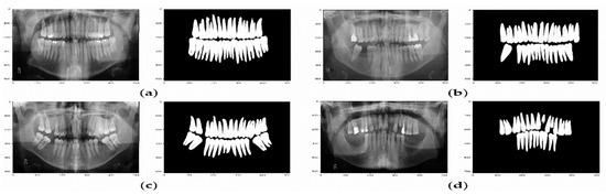 Example of predicted masks using U-Net model. (a) The X-ray image and the predicted binary mask for normal teeth. (b–d) Various X-ray images and their predicted binary masks for missing teeth.