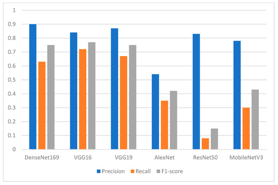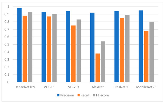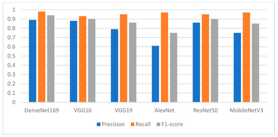 Since the main goal of this paper is to help dentists in future planning for placing dental implants, we need models that can predict the missing position of teeth more accurately. Thus, the highest F1-score of class 1 (the missing teeth class) indicates that the model detects the position of missing teeth more accurately. Figure 9 shows the performance of the pretrained models in terms of precision, recall, and F1-score. The recall of the models shows how many times the model was able to detect a specific category. The DenseNet169 is still the winner among all the other models, with recall of 0.98. AlexNet shows an interesting behavior with a recall of 0.97. Similarly, MobileNetV3 gives a recall of 0.97. The worst value is obtained with VGG16, with a recall of 0.93. In terms of precision, where the goal is to determine how good the model is at predicting the missing teeth class, the DenseNet169 gives the best value with a precision of 0.89, while AlexNet gives the worst value with a precision of 0.61. The performance of VGG16 is closer in terms of precision to the performance of the DenseNet169 model, with a value of 0.88.