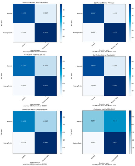 The obtained results of these deep learning models (such as DenseNet169) show that they overcome the performance of the models proposed in the previous studies. For instance, the precision values of the detected missing tooth regions were 95%, 90%, and 59.09% in [6,18,22], respectively.
