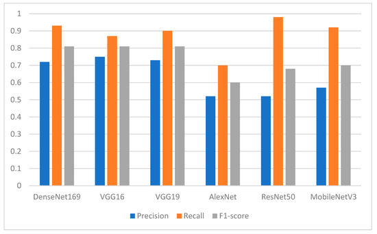 Figure 12 shows the performance of the pretrained models with respect to the missing teeth class in terms of precision, recall, and F1-score. It shows that DenseNet169, VGG16, and VGG19 achieved F1-scores of 0.81, whereas their precision and recall are different. The ResNet50 model produced the best recall results, with a value of 0.98, whereas AlexNet provided the worst results.