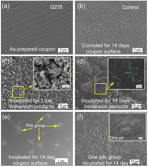 The surface morphology SEM images. (a) As-prepared Q235 carbon steel, (b) coupon corrosion in the sterile medium for 14 days, (c) adsorbed cells on the coupon incubated 1 day in the PHS-Q-inoculated medium, (d) the biofilm and products, (e) the distribution of pits groups on the coupon surface and (f) one pits group (the illustration shows the enlarged view of one pit) after 14 days incubation in the PHS-Q-inoculated medium.