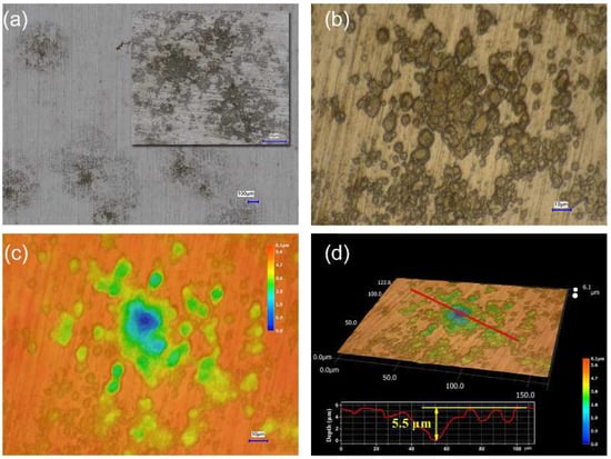 The pit depth. (a) Optical photographs of pits groups, (b) optical photograph of one pits group, (c) the height heat map of the pits group shown in (b) and (d) the 3D morphology and depth of pits on the coupon incubated in the PHS-Q-inoculated medium for 14 days.