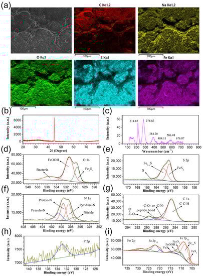 The composition of the product was detected. As shown in Figure 4a, the predominance of C, Na and O in the network-like product was displayed. S and Fe were mainly distributed in the plain area of the product layer. X-ray diffraction (XRD) only can detect the signal of the substrate (Figure 4b). In the Raman spectrum of the product (Figure 4c), three typical peaks located at 214.85, 278.83 and 384.20 cm−1 corresponded to pyrrhotite [,], while the peaks centered at 676.87 cm−1 corresponded to Fe3O4 []. To further determine the chemical composition, X-ray photoelectron spectroscopy (XPS) was employed. As shown in the high-resolution O 1s spectrum in Figure 4d, three distinct peaks located at 529.6, 531.3 and 535.2 eV corresponded to Fe3O4, FeOOH and bacteria [,], respectively. In the high-resolution S 2p spectrum, three distinct peaks centered at 161.2, 162.4 and 164.9 eV corresponded to FeS2, Fe1−xS and S, respectively (Figure 4e) []. In the high-resolution N 1s spectrum, peaks at 397.2, 398.4, 399.5 and 400.5 eV corresponded to nitride, pyridine-N, protein-N and pyrrole-N, respectively (Figure 4f) []. In the high-resolution C 1s spectrum, four peaks located at 284.8, 286.3, 287.9 and 289.5 eV corresponded to bacteria and contamination (Figure 4g) []. The P 2p on the coupon surface confirmed the presence of bacteria (Figure 4h). Finally, the high-resolution Fe 2p spectrum revealed that five peaks centered at 706.6, 708.2, 710.0, 711.1 and 714.36 eV corresponded to FeS2, Fe1−xS, Fe3O4, FeOOH and FeS, respectively (Figure 4i) [].