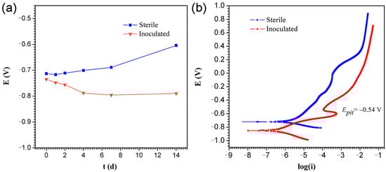 Corrosion was further characterised by the electrochemical method. Figure 5a shows the variation of OCP vs. time for the sterile and PHS-Q-inoculated conditions. The OCP values of the coupon under sterile conditions increased during the incubation. The OCP values of the coupon under PHS-Q-inoculated conditions decreased within the first 4 days and kept steady until the 14th day. This drop in potential could be attributed to an increase in the dissolution kinetics of the specimen surface caused by the PHS-Q. Figure 5b shows the potentiodynamic polarization curves of the coupon, and Table 1 shows the corresponding parameters. The data show that the corrosion current densities Icorr and the corrosion potential Ecorr of the sample in the PHS-Q-inoculated medium is less than those in the sterile media on the 14th day. The value of Ecorr was decreased in the PHS-Q-inoculated medium, suggesting that the presence of PHS-Q changed the corrosion mechanism. The value of Icorr was also decreased in the PHS-Q-inoculated medium, indicating the uniform corrosion rate on the 14th day was inhibited. The Tafel slope is correlated with the rate of electrode reaction. A smaller value of the Tafel slope is indicative of easier electron transference []. For the coupon incubated in the PHS-Q-inoculated medium, the anode Tafel slope βa is smaller, and the cathodic Tafel slope βc is larger than that of the coupon incubated in a sterile medium, indicating that the kinetics of anode oxidation reactions were promoted. PHS-Q made a detrimental effect on the Q235 or the protective film formed on the coupon surface, such as pitting corrosion. On the other hand, the cathodic reactions might be correlated with the development of biofilm or corrosion products. The anodic current peak appeared at approximately −0.54 V in the PHS-Q-inoculated medium, indicating that the presence of PHS-Q could promote the passivation of the protection film but fail to start the spontaneous passivation. The corresponding potential can be defined as pitting potential Epit. The aforementioned results reveal that the Q235 carbon steel specimens undergo different corrosion processes in the presence and absence of the PHS-Q bacterium in the nutrient-rich medium.