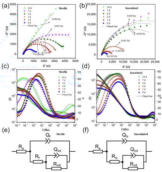 The electrochemical measurement results. The Nyquist and Bode plots for coupon in the (a,c) sterile medium and (b,d) PHS-Q-inoculated medium, and the equivalent circuit used for fitting the EIS (e,f).