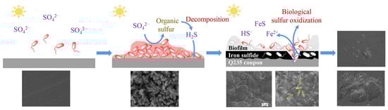 According to the experimental results, combined with the metabolic characteristics of Ectothiorhodospira sp. and the composition of the medium, a possible mechanism for the corrosion of carbon steel by PHS-Q was proposed (Figure 7). In the medium without sulfosalt except sulfate, PHS-Q consumed the organic carbon source for photosynthetic heterotrophic metabolism. In the process, PHS-Q reduced sulfate to organic sulfide. With the decomposition of organic sulfide, H2S was released, permeating through the biofilm to the metal surface and forming iron sulfide with iron ions. The protective film formed on the carbon steel surface was composed of iron sulfide and a biofilm. In local areas, PHS-Q colonises directly on the iron sulfide surface. The sufficient sulfide and light initiated the pathway of photosynthetic autotrophic metabolism of PHS-Q. The sulfide formed on the surface near the PHS-Q-colonised area was gradually broken down, even exposing the metal substrate. The exposed area of the Q235 coupon was very small compared with the protective corrosion layer area. As we know, the Icorr is the average corrosion current of the whole electrode plane. Thus, the value of corrosion current Icorr was reduced by PHS-Q. The impedance modulus values were increased by PHS-Q. The exposed fresh metal surface continued to form the small anode and large cathode corrosion coupled with the surrounding protective film, which accelerated the corrosion rate of the metal matrix, eventually forming a pit. During bacterial adsorption and subsequent development into a biofilm, the biofilm exhibited the characteristic of being thick in the middle and thin at the edge. Thus, the pits located in the middle were deep, and those located at the edge were shallow.