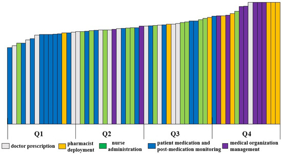 The sorted failure modes were divided into quartiles (zones Q1–Q4). Zone Q1 contained the top 25% failure modes according to risk grade, which was also in urgent need of improvement. All failure modes (nine in total), which accounted for 56.25% of patient medication and post-medication monitoring, were located in Q1. Q1 contained four drug use links, excluding the link to medical organization management. Figure 1 shows various failure modes according to risk (in order from high to low). The color distribution of each link shows that patient medication and post-medication monitoring had the highest risk, followed in order by doctor prescription, nurse administration, pharmacist deployment, and medical organization management.