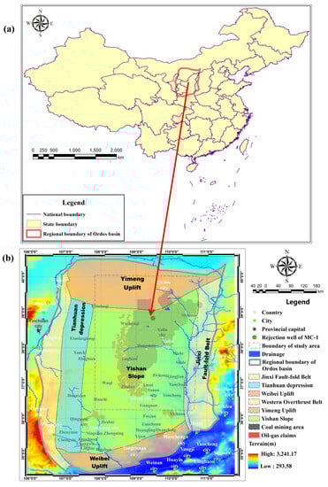 (a) The location for the Ordos Basin and the study area, (b) coal mining claims distribution and geological structure in the study area.