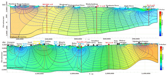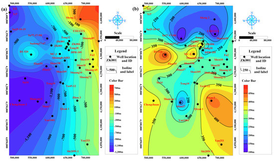 According to the data mining and analysis for the identified 37 wells from salt and coal mines, oil and gas fields, we generalized the spatial geodata in the study area of LFm as shown in Figure 3a,b. The overall trend indicates that the inclination from the east to the west due to its location on Yishan Slope [30]. The top boundary elevation of LFm ranges from −1287 m to 615 m, the bottom boundary elevation ranges from −1642 m to 402 m with its thickness of 115 m to 465 m. By the domination of whole and small-scale fluctuation of layers, the LFm appearance was inclined from east to west. The eastern and western depth was up to 700 m and 2700 m, respectively. Under the predominantly horizontal strata tendency, some distinction rules were identified, e.g., the northern zone located on the Yimeng Uplift [31] had a relatively small thickness of 115–250 m, whereas the LFm thickness in the southeastern and western zone located on the Yishan Slope is stable and continuous.