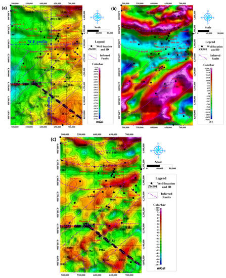 (a) Bouguer gravity anomaly, (b) Reduction-to-the-pole of magnetic anomaly, (c) Small-scale of residual gravity anomaly for the study area.