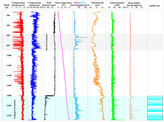 Geophysical logging with the various methods of compensation density, sonic, diameter, temperature, shallow/deep lateral logging, self-potential, natural gamma and deep-shallow difference of lateral logging for the MC-1 well in Muduchaideng coal mine. The aquifers distribution in LFm is shown in the right column.
