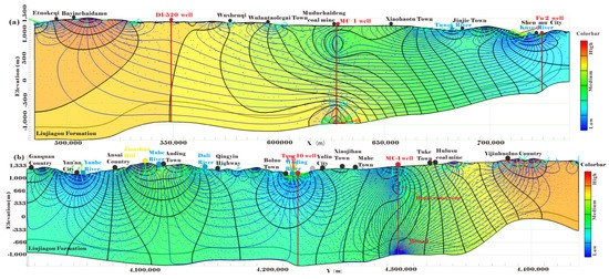 Regional groundwater head and flowline change induced by mine water injection activity through the MC-1 well for (a) W-E and (b) S-N cross section. Mine water drainage in shallow aquifers and water injection activities in deeper strata around the MC-1 well were simulated to manifest their effect on the regional circulation of groundwater.