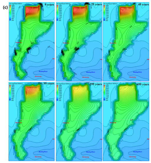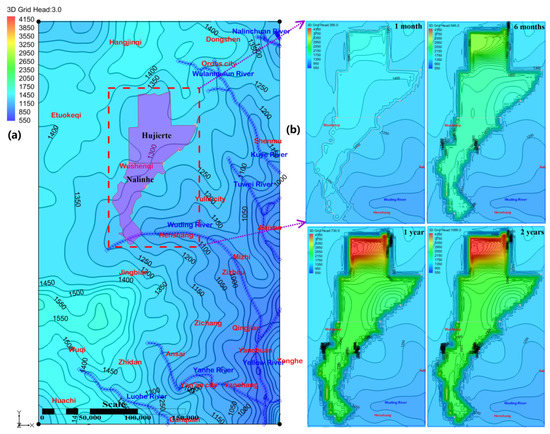 The natural and original region-scale groundwater field of LFm was presented in Figure 8a. The discharge zones with a lower elevation consisted of the Yellow River catchment [68] with its distributaries: the Wulanmulun River, Kuye River, Tuwei River, Wuding River, Yanhe River and Luohe River. Our objective was to scrutinize the evolution process of mine water injection within 1 year at the rate of 25,000 m3/d for each well. The long-term evolution of different groundwater fields is shown in Figure 8b. The hydraulic fracturing process and vertical leakage through the caprock were not considered in this simulation due to the restriction and constraint from the stable, thick and stratiform rocks in Ordos Basin. The process of hydraulic fracturing was important to clarify the environmental influence and groundwater evolution; it was a complex and challenge topic. The vertical leakage of mine water through borehole well, large faults and fault re-activation from the injection activities would cause more serious groundwater pollution than the directly surface drainage. This paper concentrated on the ideal groundwater flow in the stratiform LFm, which was fractured by the continuous mine water injection with the bottom hole pressure up to 32.0 MPa.
