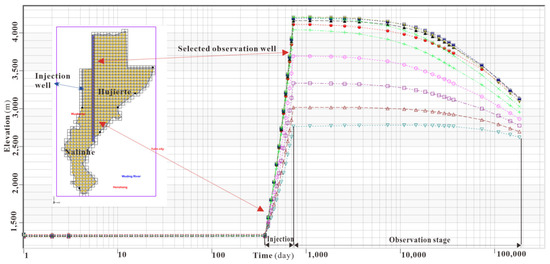 Low groundwater velocity and the rock properties of LFm constrained the migration scope of mine water injection, which was similar to the CO2 Capture, Utilization and Storage Program in Shenhua experimental site in Ordos Basin. Relatively low porosity and permeability LFm was favorable for fluid storage due to the wellbore storage effects would clearly separate the hydraulic fracturing region and originally undisturbed LFm. Therefore, mine water injection activities in Hujierte and Nalinhe coal mining regions had significantly increased the water pressure, flow velocity and altered local groundwater subsystem for LFm. The external region around the above coal mining region was not showed high groundwater contours. Only the groundwater gradient zone with high dense isolines was distributed between them. With the continuous constant injection rate at the initial period of 1 month, the system response of groundwater pressure to injection is very rapid, with the notable increases in groundwater contour [69]. The characteristics of local groundwater head contour were similar to the regional groundwater gradient because mine water was filling with the pores and fractures [70]. The fractures resulting from the continuous hydraulic fracturing by mine water injection and original fissures generated by the tectonic stress and movement together became the main flow conduits of the mine water. The velocity of mine water flow along these fractures was obviously higher than the migration through pores. The dual fracture porous medium model [71] applied in LFm can be employed for simulation of mine water injection activities. After a period of 6 months, the relatively thin LFm in the north of Hujierte caused the wellhead water table to be over 2750 m close to these injection wells. Its groundwater contour morphology was found to be in negative correlation with the thickness of LFm. As the time was longer than 1 year, all the wellhead of each grid reached its maximum. The wellhead water table ranged from 2050 m to 4200 m in Hujierte and Nalinhe coal mining regions. When the mine water injection terminated, the water pressure observation of each well injection was resumed, and the observation table lines are shown in Figure 9.