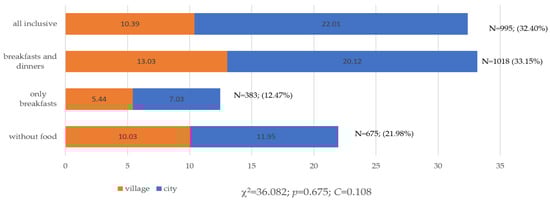 Most of the respondents, as much as 33.15%, purchased breakfast and dinner, and slightly fewer picked the all-inclusive option (32.40%). The next group of respondents purchased holidays without meals in a hotel (21.98%), and breakfast was bought only by 12.47% of the surveyed tourists.