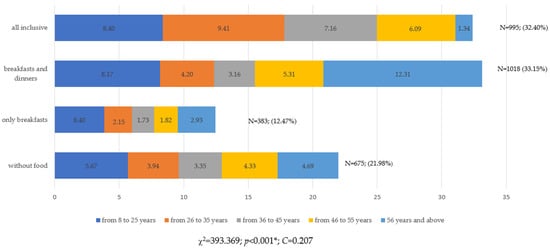 Most of the youngest people used the all-inclusive option (8.40%), and the oldest people used the breakfast and dinner option (13.31%) (