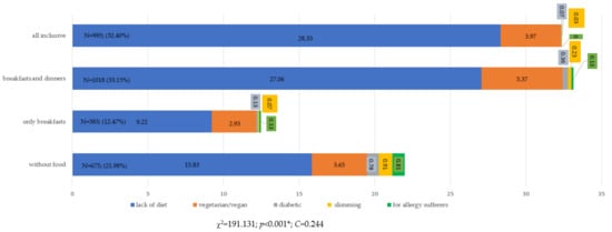 Figure 5). Those without any diet were most likely to choose the all-inclusive option, vegetarians/vegans were most likely to buy breakfast and lunch at the hotel restaurant, and those with diabetic, slimming and allergic diets were most likely not to use the food at the hotels. It should be noted that none of the respondents with allergies chose the all-inclusive option.
