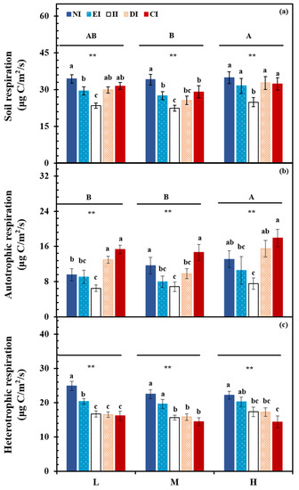 Soil (a), autotrophic (b), and heterotrophic (c) respiration under treatments. NI = non-invasive stage treatment, EI = early invasive stage treatment, II = intermediate invasive treatment, DI = dominant invasive treatment, CI = completely invasive stage treatment, L = low water level treatment, M = intermediate water level treatment, and H = high water level treatment. ** present significant at p < 0.01 among water level treatment, respectively. Different lower-case letters above column represent significant differences (p < 0.05) among invasive degree treatments.
