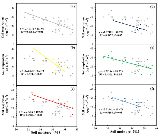 (a) Linear model of soil respiration and soil moisture under all invasive stages (gray points and line). (b–f) Linear model of soil respiration and soil moisture under non-invasive stage (yellow points and line), early invasive stage (red points and line), intermediate invasive stage (navy blue points and line), dominant invasive stage (green points and line), and completely invasive stage (light blue points and line).