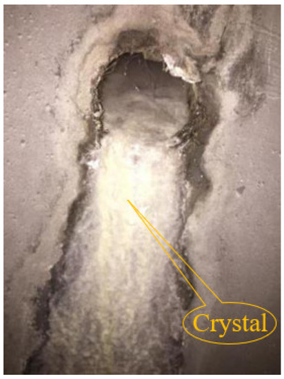 Chemical treatment is to inject a dissolving agent to react with crystals in the drainage pipe, so that crystals will gradually dissolve and flow away along the pipe water flow. The chemical method is simple, effective, and economically efficient, but it causes corrosive damage to the tunnel structure and has a great impact on the surrounding groundwater and soil environment. Thus, it is used less in the practical treatment of crystalline blockages in tunnel drainage pipes. At present, the commonly used chemical treatment methods are complexation, acid, and synthetic methods. The chemical treatment technique is convenient, where the chemical reagents can be directly poured into the drainage ditch, or injected into the transverse drainage pipe through special equipment, so as to achieve the treatment of crystalline blockages in tunnel drainage pipes.