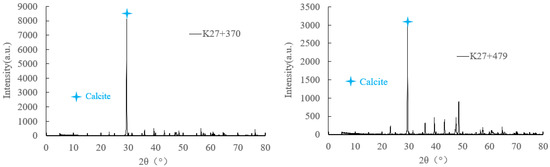 As can be observed in Table 2, the Ca2+ concentration in groundwater ranged from 35 to 80 mg/L, the Mg2+ concentrations were all lower than 20 mg/L, the total groundwater hardness ranged from 140 to 270 mg/L, and the HCO3− concentration ranged from 100 to 220 mg/L. Among the seven groundwater samples, one groundwater sample (K27 + 428) had a HCO3− concentration of 0, but CO32−, OH− not 0, which was in contrast with that of the remaining six groundwater samples. The groundwater of this groundwater sample was strongly alkaline (pH greater than 10, greater than that of the remaining six groundwater samples). This was because the chemical reaction between HCO3− and OH− generated CO32−, and the excess OH− was in a free state. The free CO2 concentration of this groundwater sample was 0, while the remaining six groundwater samples all contained free CO2, indicating that the CO2 of this groundwater sample was dissolved in water and involved in the crystallization reaction.