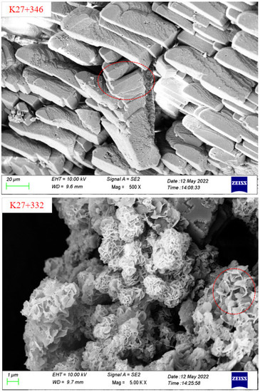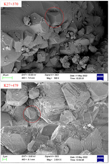 The analysis of crystalline composition and microscopic forming were performed by XRD and SEM. The microscopic test of crystal samples was commissioned to Chongqing Nuojiang Two-dimensional Materials Research Institute Co., Ltd. The main compositions of the crystalline samples were determined by comparing the diffraction patterns of each crystalline material with the standard diffraction pattern of calcium carbonate, to compare their respective diffraction angles and peaks. Lee et al. [25] and Higashitani et al. [26] point out that CaCO3 crystals can be divided into calcite, aragonite, and vaterite, among which calcite is the easiest to form and the most common. Nebel and Epple [27] found that the XRD diffraction pattern of calcite demonstrated the main peak at the diffraction angle of 2θ = 29°, while the aragonite’s peaks were 2θ = 26° and 2θ = 46°. Figure 4 illustrates that the XRD diffraction patterns of crystalline samples all displayed the highest diffraction intensity at 2θ = 29°, indicating that the crystalline material was mainly calcium carbonate. According to SEM analysis of the crystalline material, most of the crystals were lumps, some crystals contain crusts, and the lumps were either tightly packed or loosely packed, indicating that the growth variation of crystalline material crystal shape was highly related to groundwater environment or surrounding temperature and humidity. This is consistent with the research results of Rinder et al. [28], Zhang et al. [29], Jiang et al. [30], Wu et al. [31], Stefanie et al. [32], Guo [33], and Ye et al. [34]. Calcium carbonate crystal plugging is mainly affected by pH value, temperature, CO2 partial pressure, water flow rate, drainage pipe slope, etc. The precipitation rate of calcite crystalline calcium carbonate is the highest when the pH value is close to 10 [33]. The natural calcium bicarbonate solution only produces calcite at 25 °C. The rapid evaporation and slow diffusion of the solution are conducive to the formation of aragonite [35]. When the water temperature is 40~50 °C, the crystal morphology is mostly regular blocky crystals, with the largest crystal size [36]. The partial pressure of CO2 has a great relationship with carbonate crystallization sedimentation, and CO32− is mainly derived from CO2 dissolved in groundwater [31]. Liquid velocity, liquid level height, drainage pipe diameter, and the internal wall friction coefficient will also have an important impact on the precipitation crystallization rate of drainage pipes [37,38,39]. The precipitation of calcium carbonate depends not only on the hydraulic conductivity and CaCO3 content of surrounding rock, but also on the properties of lining materials and the geometry of the tunnel [40]. A low dosage of sodium aluminate will accelerate the leaching of calcium, thus reducing the leaching resistance of shotcrete. A high dosage of sodium aluminate will inhibit the leaching of calcium, thus improving the leaching resistance of shotcrete [41].