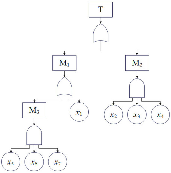 After determining the events involved in transverse drainage pipe blockage, a fault tree was established based on Heinrich’s Law, a theory about accident causality, as illustrated in Figure 5. The code factors are provied in Table 3. Through the construction of the fault tree, the subway tunnel operation managers can fully grasp all the possible causes (basic events x1~x7) of the top event (T), but the logical relationships between these basic events are not yet clear. Thus, qualitative and quantitative analysis of the fault tree was needed.