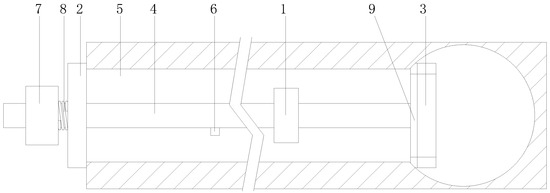 In view of the crystalline blockage in transverse drainage pipes in subway tunnels, the following ultrasonic resonance treatment device (Figure 11) is designed. The device mainly includes an ultrasonic resonance part, an external blocking plate, internal retractable blocking components, and a water injection pipe. Both the external blocking plate and the internal retractable blocking component are installed on the water injection pipe. The external blocking plate blocks the outlet end of the transverse drainage pipe, and the internal retractable blocking component blocks the inlet end of the transverse drainage pipe. The ultrasonic resonance part is installed on the water injection pipe with an outlet between the external blocking plate and the internal retractable blocking component. In Figure 11, 1 is the ultrasonic resonance part, 2 is the external blocking plate, 3 is the internal retractable blocking component, 4 is the water injection pipe, 5 is the transverse drainage pipe, 6 is the outlet, 7 is the controller, 8 is the first offset spring, and 9 is the arc-shaped rubber sealing gasket.
