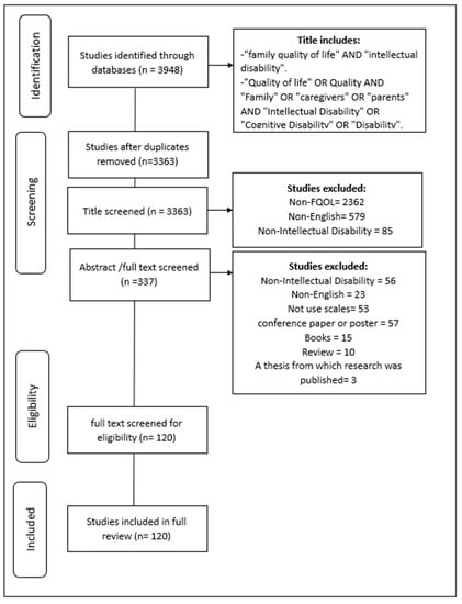 Following a thorough search of the six databases, 3948 studies were identified as potentially relevant to this study. Following a title screen, 585 studies were removed due to duplication and 2362 studies were excluded because they addressed other topics unrelated to FQoL. In addition, the title screening excluded 85 studies because they were unrelated to intellectual disability and 579 because they were not in English, representing around 19% of the excluded studies at this stage. Following an abstract/full text screening of 337 studies, 120 studies were finally included in this study (see Figure 1 for the description of all exclusion criteria in each step).