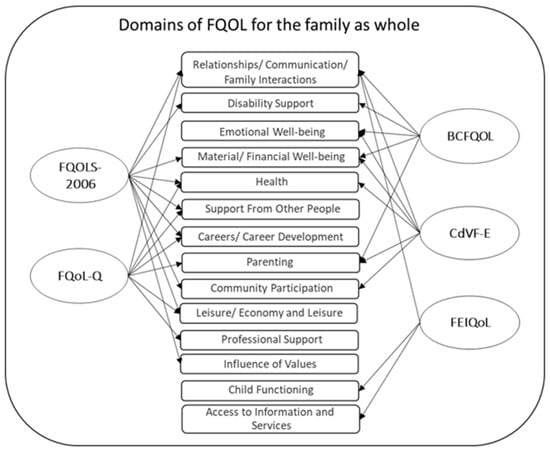 The number of domains used in the current scales ranges from three to nine. Figure 3 displays an overview of all domains used in the five FQoL scales. Relationship, communication, and family interaction are used as the most important predictors of the FQoL in all scales, followed by education, health, and material and financial well-being, which were included in three scales. Most domains are frequently used in at least two scales. The dimensions used in one scale were professional support, influence of values, child functioning, and access to information and services. A significant agreement between BC-FQoL and FQoLS-2006 exists in the domains of well-being, family relationships, and disability-related support. An overview of the respective domains and subdomains covered by the different FQoL scales follows the overview in Figure 3.