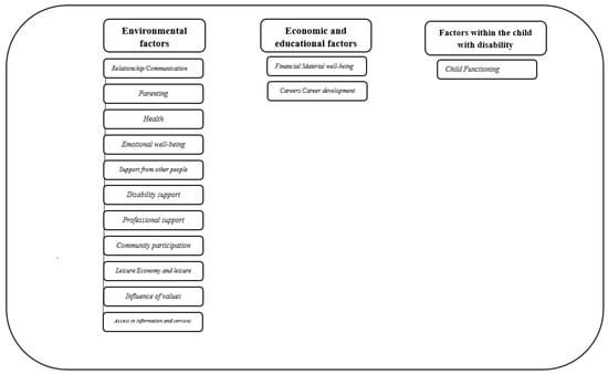 The domains used in the five FQoL scales were grouped into three overarching categories: environmental factors, economic and educational factors, and factors within the child with disability. This classification helps to clearly structure the multitude of domains included in the scales, which are described in detail below.