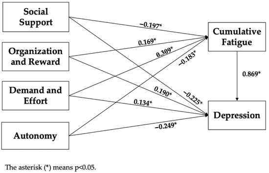 The Bootstrap method was used to test the mediating effect of cumulative fatigue between occupational stress and depression symptoms, and the judgment basis was whether 0 was included in the 95% confidence interval. The independent variables were occupational stress and its dimension scores, the dependent variable was depressive symptom scores, the mediating variable was cumulative fatigue scores, and the control variables were marital status, monthly income, posts, and weekly working hours. The total effects of occupational stress on depressive symptom scores were divided into direct effects and indirect effects (i.e., mediating effects). The total effect was the effect of the independent variable of occupational stress on the dependent variable of depressive symptoms when the mediating variable was not controlled. The direct effect was the effect of the independent variable of occupational stress on the dependent variable of depressive symptoms after controlling the mediating variable. The indirect effect was the effect of the independent variable of occupational stress on the depressive symptom scores of the dependent variable through the mediating variable cumulative fatigue scores. As shown in Table 4, 0 was not included in the 95% confidence interval of the mediating effect of the cumulative fatigue between occupational stress and its dimensions (“social support”, “organization and reward”, “demand and effort”, and “autonomy”) and depressive symptoms, which meant a mediating effect. The cumulative fatigue played a partial mediating role between occupational stress and depressive symptoms, and the mediating effect values in occupational stress and various dimensions were 0.116 (95% CI: 0.096–0.135, p < 0.001), −0.204 (95% CI: −0.245–−0.166, p < 0.001), 0.179 (95% CI: 0.143–0.218, p < 0.001), 0.333 (95% CI: 0.283–0.385, p < 0.001), and −0.210 (95% CI: −0.292–−0.132, p < 0.001); the percentage of mediating effects was 43.56%, 44.46%, 44.58%, 71.26%, and 45.80%, respectively, as detailed in Table 7. The mediating effect model is shown in Figure 2. Among them, the effect value of social support on cumulative fatigue was −0.197 (p < 0.05), and the direct effect value on depressive symptoms was −0.225 (p < 0.05); the effect value of organization and reward on cumulative fatigue was 0.169 (p < 0.05), and the direct effect value on depressive symptoms was 0.190 (p < 0.05); the effect value of demand and effort on cumulative fatigue was 0.309 (p < 0.05), and the direct effect value on depressive symptoms was 0.134 (p < 0.05); the effect value of autonomy on cumulative fatigue was −0.183 (p < 0.05), and the direct effect value on depressive symptoms was −0.249 (p < 0.05); the effect value of cumulative fatigue on depressive symptoms was 0.869 (p < 0.05).