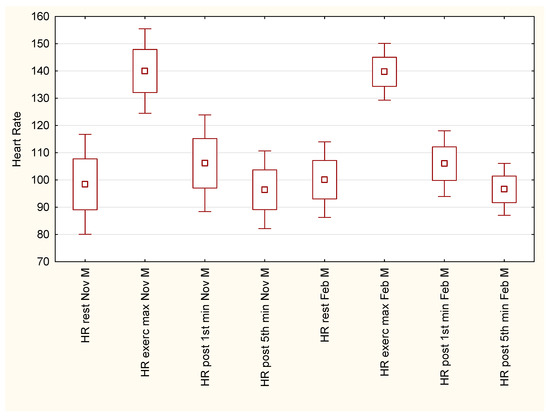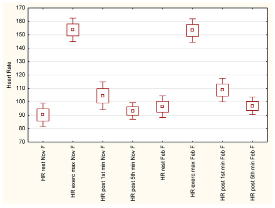Heart-rate values at the 5th minute of post-exercise recovery were even lower than in pre-test conditions, but these changes were insignificant. According to the Tukey post-hoc test, heart-rate variations did not differ substantially between November and February/March measurements.