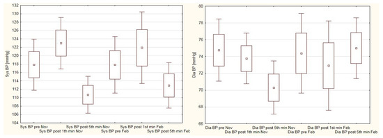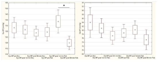 Statistical calculations were performed with Statistica 12.0 software (StatSoft, Tulsa, OK, USA). The results of the Shapiro–Wilk test confirmed the normality of the analyzed data. Analysis of variance (ANOVA) and the post-hoc Tukey test were used to detect the differences in heart rate and blood pressure variations in both terms of the examination. A paired t-test was used to calculate the differences between the VO2max values measured in November and in February/March.