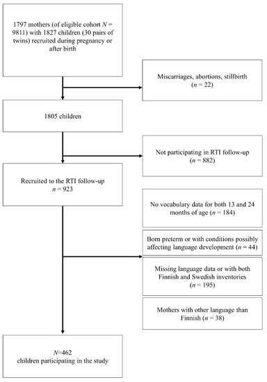 Of 1805 liveborn participating children, a subgroup of 923 children (912 families) participated in the present substudy for the intensive follow-up of RTIs. The children were closely followed for RTIs, including AOMs, during the first two years of life [11]. In the present study, we aimed to longitudinally investigate expressive vocabulary development and included only children with available vocabulary data for both 13 and 24 months of age. In total, 184 children had language data for only one of the measuring points and thus were not included. The exclusion criteria were preterm delivery, missing or ambiguous data on gestational length, diagnoses or conditions connected with language problems, missing language data, and families who did not speak Finnish at home. After these exclusions, the sample size for analysis was 462 children (54% boys) from 460 families. The participants included two twin pairs (three girls and one boy). The recruitment procedure is described in Figure 1.