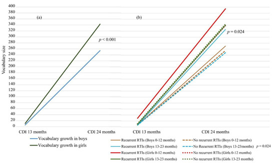 (a) Vocabulary growth in boys and girls between 13 and 24 months of age differed significantly (p < 0.001). (b) Mean vocabulary growth between 13 and 24 months of age in boys and girls with and without recurrent RTIs at 0–12 months of age and 13–23 months of age. CDI = MacArthur–Bates Communicative Development Inventory, RTI = respiratory tract infection. t-test for independent samples.