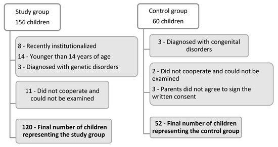 The study group initially included 156 children, of which 36 were excluded from the study for not meeting our inclusion criteria (8 children were recently institutionalized, 14 were younger than 14 years of age, 3 children were diagnosed with genetic disorders at birth, and 11 children did not cooperate and could not be examined).