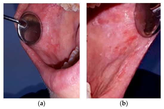 Chronic keratosis (Morsicatio buccarul) in a 17-year-old girl: (a) keratotic lesion on the oral mucosa of the right cheek; (b) keratotic lesion on the oral mucosa of the left cheek.
